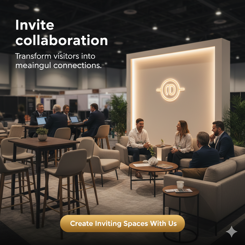 Sometimes the best design gives people room to breathe. Instead of crowding walls, create an open meeting space within your booth. For example, push your graphic wall back and place bar-height tables or lounge chairs in front. This invites visitors to step in, sit, and have longer conversations. Add spot lighting on your seating area to make it cozy.