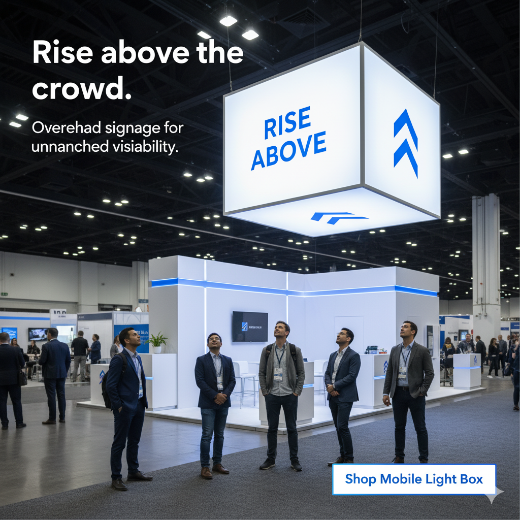 Hanging signage or overhead graphics can capture attention across the aisle. If venue rules permit, suspend a backlit logo or fabric sign above your booth. Even in a 10×10 booth, a hanging element (e.g. a lightbox cube or banner) adds an unexpected twist. In a 20×20 island, you have room for a sizable hanging structure like a glowing “cloud” or an LED sphere with your emblem.