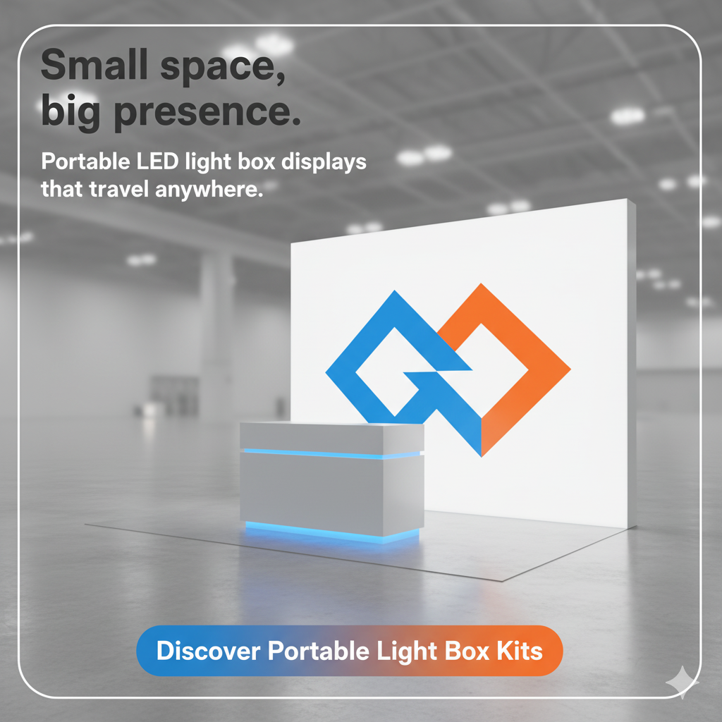 For startups and small teams, a compact 10×10 portable display booth should still look professional. Focus on a single statement wall and a clean layout. A tall portable mobile lightbox on the back wall displays your logo and tagline. Use a small counter or demo podium in front – make sure it’s branded too. The rest of the space can be kept open or used for a narrow table.