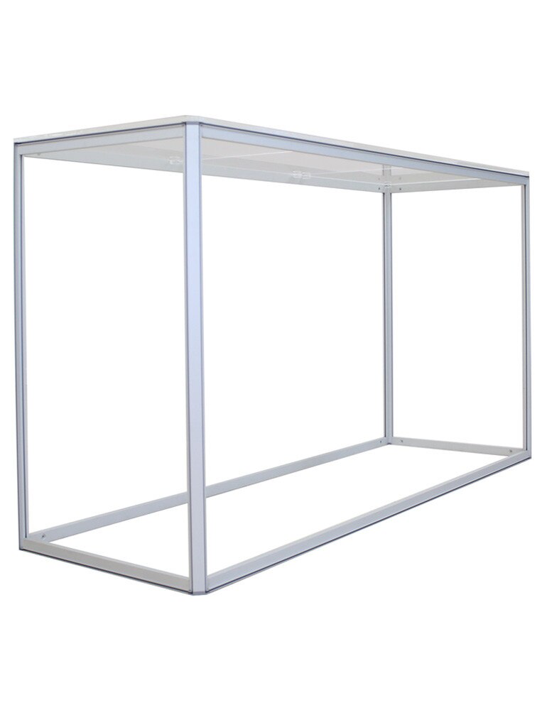 Big Sky Counter is part of the Resort Extrusion family aluminum frames for Silicone-Edge Graphics (SEG). Custom-made on the premises, Big Sky Counter comes in varied sizes. Big Sky Counter accepts four individual custom fabric graphics, excluding top and bottom. Insert graphics after frame is constructed by tilting it on its side. Transversely, push corners of graphic into the frame’s recessed groove. Then, starting midway on the frame going toward the corners, continue pushing in the straight edges of the graphic. Repeat three times. Place the frosted acrylic countertop last.