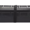 Its rectangular shape and inset wheels make it easy to stack or pack, fitting in spaces a rounded hard case won’t. The two-piece box has luggage straps with clip buckle ends that wrap around the closed case and lock in place, secured in the harness slots.